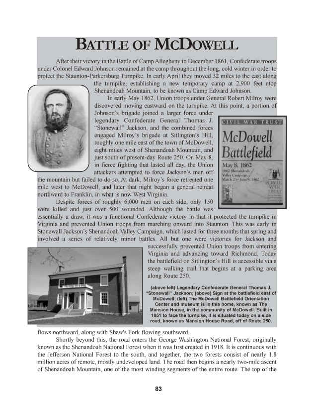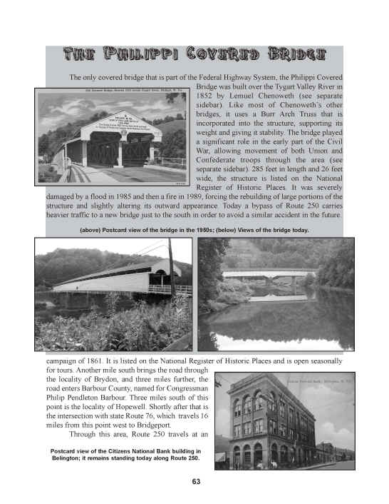 This book explores the original road as well as its various realignments over the years. Aided by nearly 450 black and white images of photos, postcards, etc., the story of a fascinating American road is told. In particular, the route's numerous links to Civil War battle sites in the Virginias are detailed. Noted generals Robert E. Lee, Philip Sheridan, George Armstrong Custer, Robert Milroy, Edward Allegheny Johnson, Stonewall Jackson, and Jubal Early fought in battles along the road's course. Much of what is today known as Route 250 was originally carved through the region as part of the turnpike era of pre-Civil War Virginia (in what is now West Virginia). Much of the Staunton-Parkersburg Turnpike and other lesser-known roads later evolved into Route 250, linking it to the region's earliest settlers. In Virginia, a large section of the route was originally part of the Three Notch'd Road, known to have been cleared as early as the 1730s, and which was in use by Native Americans long before that. In addition to history, the remarkable scenery along the road is detailed, as the road moves from Cedar Point on the shore of Lake Erie through the rural Amish Country of Central Ohio and into the foothills of Appalachia in Eastern Ohio and West Virginia. It then begins a roller-coaster ride of peaks and valleys in the mountain region, finally crossing the Blue Ridge Mountains at Rockfish Gap and then descending to Charlottesville and finally Richmond, where many historic buildings remain. some more than 200 years old. In particular, the Ohio towns of Sandusky, Norwalk, Milan, Ashland, Wooster, Dover, New Philadelphia, Cadiz, and Bridgeport are covered, along with the West Virginia towns of Wheeling, Moundsville, Fairmont, Philippi, Belington, Elkins, Beverly, and Durbin, and the Virginia towns of Monterey, Staunton, Waynesboro, Charlottesville, and Richmond. The book includes 40 sidebars of sites, people, trivia, and events that are linked to the road, such as Thomas Edison, Clark Gable, Woodrow Wilson, and Thomas Jefferson, all of whom were born along or close to the road. It also describes The Lincoln Highway and National Road, both of which shared brief sections of Route 250. The historic covered bridge at Philippi, WV. is the only such bridge that is part of the Federal highway system, and is described here, as are four colleges that lie along the course of Route 250. This book makes an ideal travel companion, whether one is covering the road's entire length or is just out for an afternoon drive.