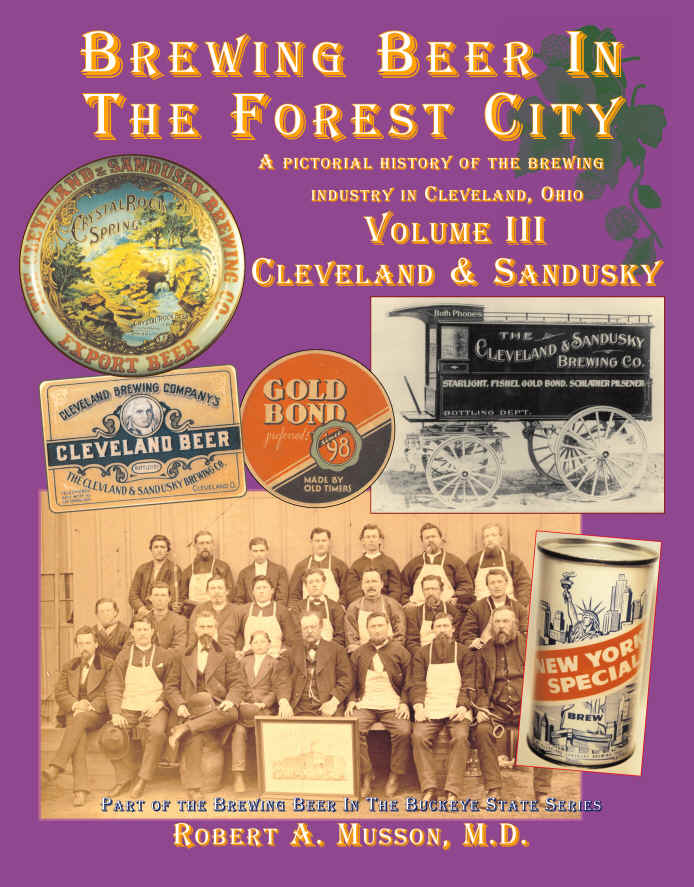 Part of the Brewing Beer in the Buckeye State Series, this third of five volumes giving a pictorial history of Cleveland breweries covers the fourteen breweries (in Cleveland, Lorain, and Sandusky) that comprised the Cleveland & Sandusky Brewing Company. Formed in 1898, Cleveland & Sandusky was one of the largest brewing corporations in pre-Prohibition America. Barely surviving Prohibition, the company continued to operate until 1962, producing local favorites Crystal Rock and Gold Bond Beers, and Old Timers Ale. Spiral-bound, it has 82 pages and nearly 450 images, mostly in color, of people, buildings, labels, signs, and you name it.